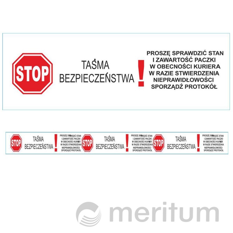 Taśma z nadrukiem TAŚMA BEZPIECZEŃSTWA z emulsją klejową na bazie syntetycznego kauczuku. Aplikacja w pomieszczeniach zamkniętych i półotwartych w temperaturze od 5 - 40 st. C. Przeznaczona do zaklejania wszystkich rodzajów kartonów zarówno metodą ręczną i maszynową. Grubość nośnika wraz warstwą klejącą 45 mic. Czas wiązania kleju - szybki.